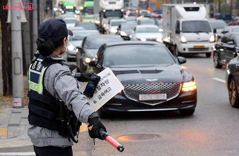 2024학년도 대학수학능력시험일 오전, 서울 양천구 금옥여자고등학교 앞에서 경찰관이 교통 정리를 하고 있다
