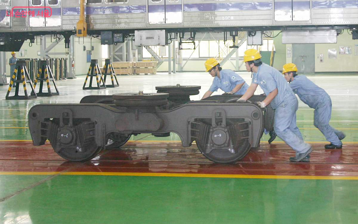 차량기지에서 분리된 전동차의 대차. 중앙 위쪽에 있는 둥근 것 2개가 에어스프링이다. ©한우진