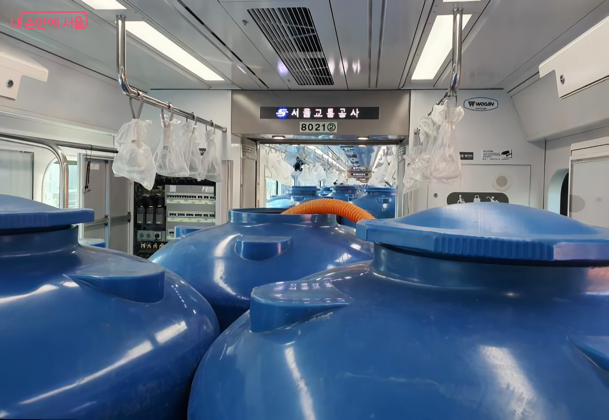 한편 서울시가 공개한 8호선 시운전 소식 자료를 보면 흥미로운 사진을 확인할 수 있다. 전동차 내에 커다란 파란 물탱크가 가득 차 있는 모습이다.
