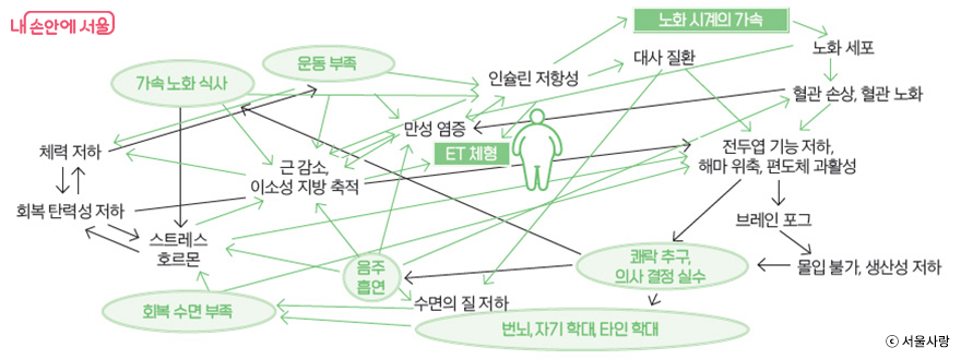 실제로 단순히 노안(老顔)이 되는 것을 넘어 당뇨, 고혈압, 고지혈증, 퇴행성 관절염 같은 만성질환이 2030 세대와 MZ세대를 위협하고 있다. 물론 선천적인 노화 요인은 바꿀 수 없다. 그러나 식습관, 운동, 스트레스 관리 등 후천적인 노력으로 노화 속도를 조절할 수는 있다. 정 교수는 여러 요소 중 가장 중요한 것으로 ‘식습관’을 꼽으면서 “큰 인구 집단을 중심으로 연구해보면 식사가 수명에 가장 큰 영향을 미친 것으로 나타났다”며 “건강한 식사는 건강하지 않은 식사보다 10년 정도 수명을 늘려줄 수 있다”고 말했다.