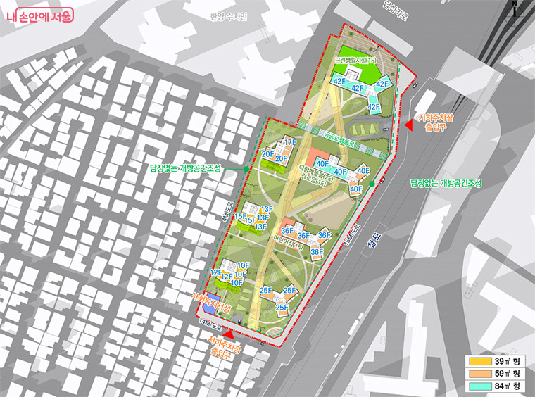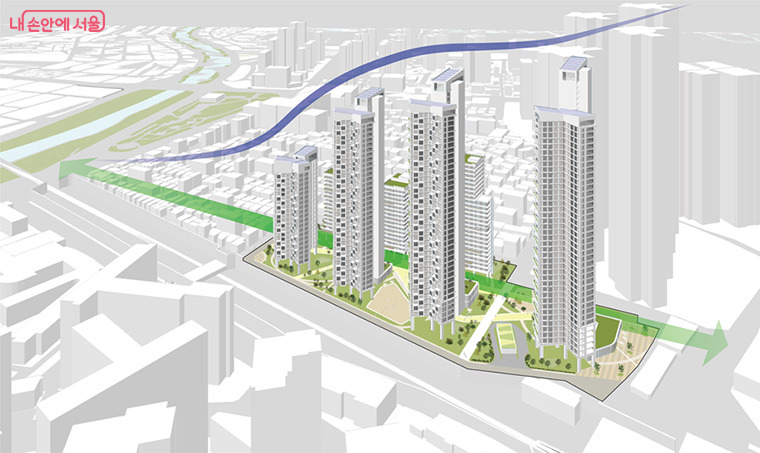 셋째, 도시 경관을 개선한다. 청량리역 일대 개발 방향에 맞춰 남북 방향으로 시야를 트이게 하고, 청계천의 자연친화적 경관과 조화되도록 설계한다. 또한 철도변 소음을 차단하는 특화 디자인을 적용해 쾌적하고 조화로운 도시 이미지를 형성한다. 북측에는 최고 42층의 주동을 배치해 남측에서 북측으로 갈수록 높아지는 텐트형 스카이라인을 형성할 예정이다.