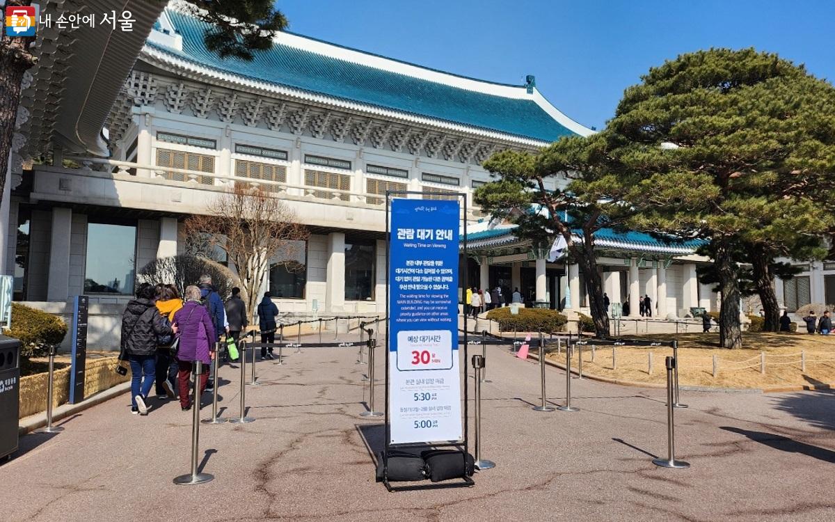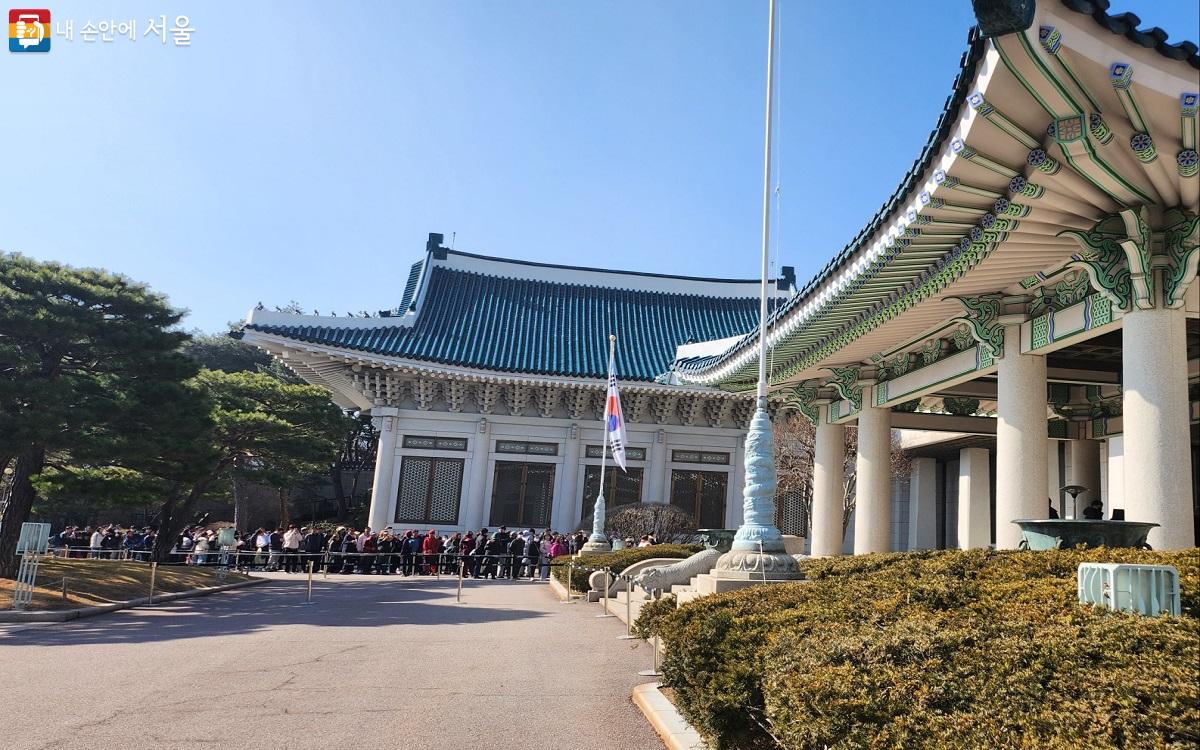 많은 관람객이 청와대 본관에 입장하고 있다.
