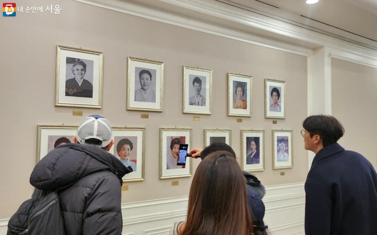 본채 1층 무궁화실에 걸린 역대 영부인의 사진을 관람하고 있다.