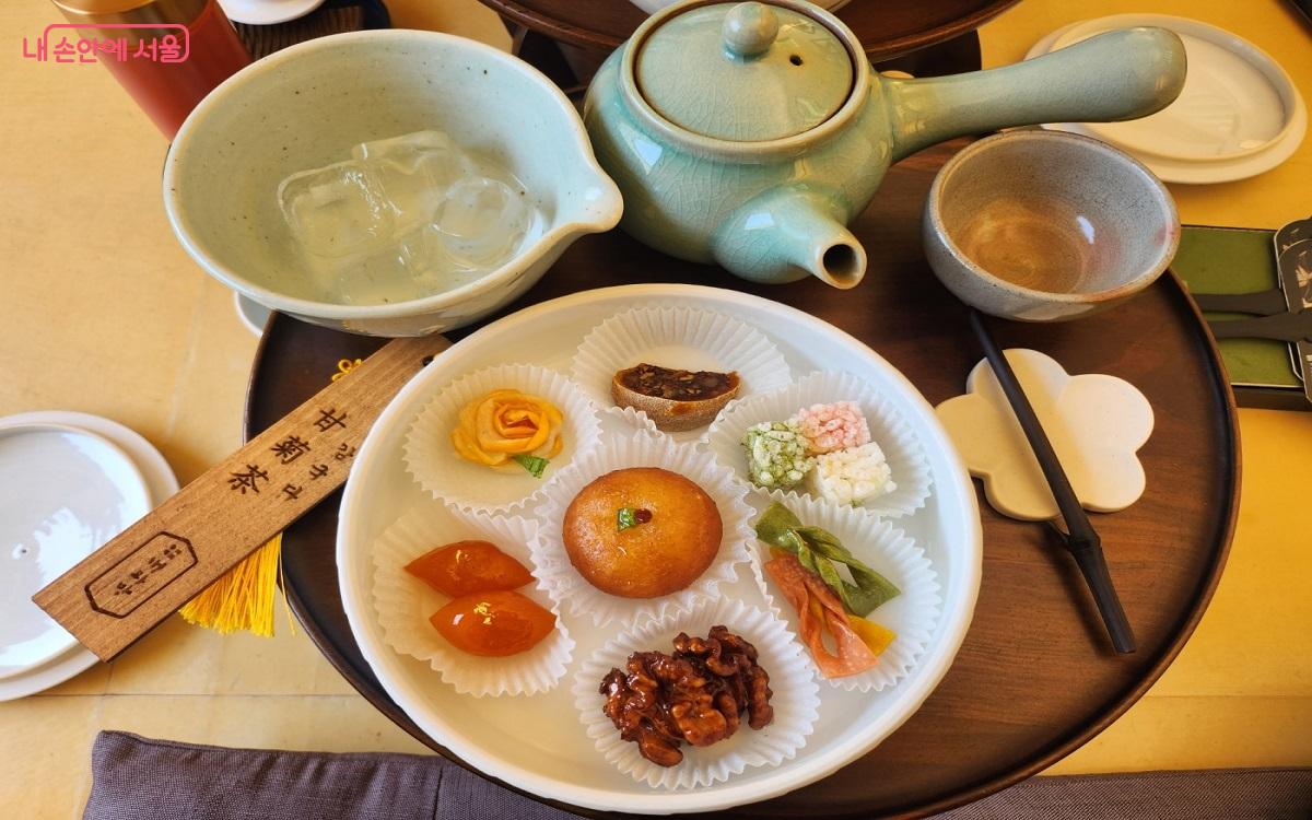 사전에 선택한 주악 세트는 미리 준비되어 있었으며, 입장할 때 선택한 차는 차패와 함께 잠시 기다리면 준비해 주신다. 기자가 선택한 주악 세트는 주악, 곶감단지, 참외정과, 매작과, 금귤정과, 호두정과 구성으로 준비되어 있었다.