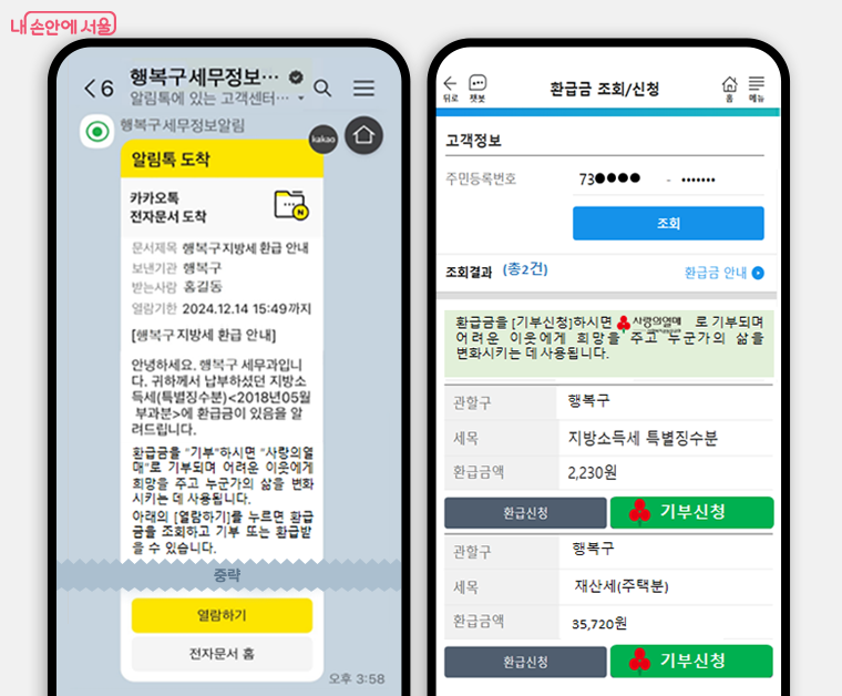 카카오톡 알림의 경우, ‘열람하기’를 클릭하면, 세금납부시스템인 ‘이택스(ETAX)’로 연결, 환급금 조회 후 계좌번호 입력 등을 통해 환급 받거나 기부를 신청할 수 있다.