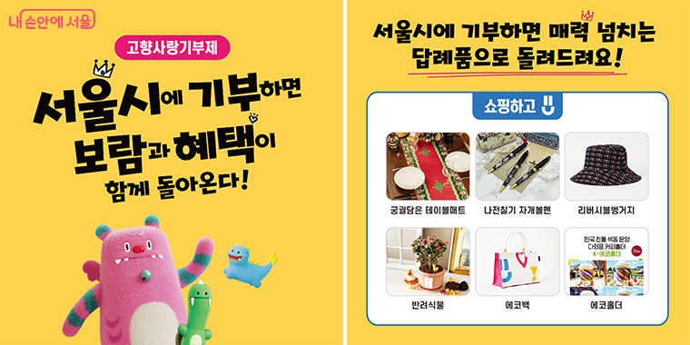 한편, 서울시는 고향사랑기부자를 위한 답례품을 다채롭게 마련하고, 서울 외 거주자들의 기부를 독려하고 있다. ‘고향사랑기부제’는 개인이 자신의 거주지를 제외한 다른 지방자치단체 (광역, 기초)에 기부하고, 지방자치단체는 기부금으로 고향사랑기금을 조성해 취약계층 지원, 문화·예술 사업 등 주민복리 증진에 사용할 수 있는 제도다.