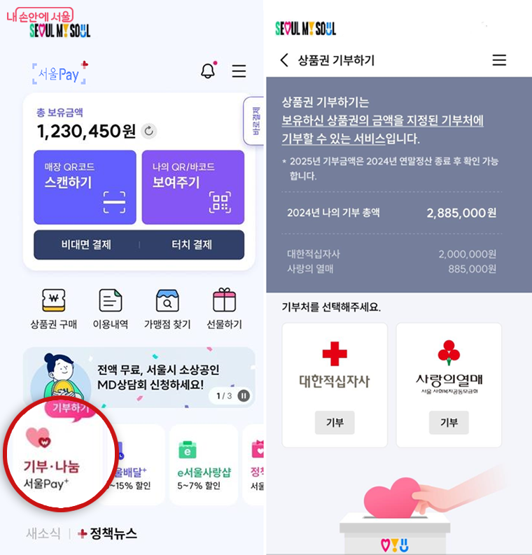 서울페이플러스 앱 홈화면의 ‘기부‧나눔’ 버튼(좌) 기부처 선택 화면(우)