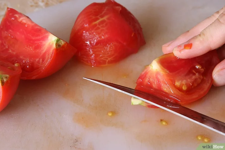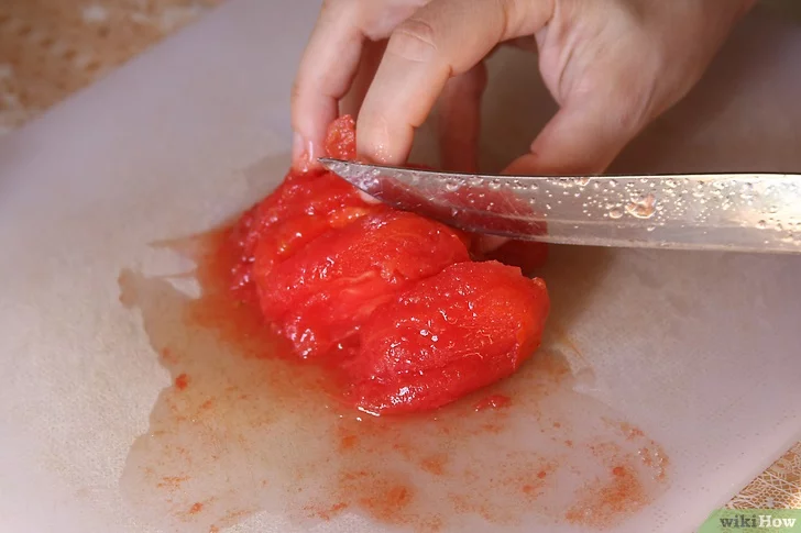 토마토 조각의 한쪽 끝부터 조심스럽게 과육에서 껍질을 잘라내기 시작한다. 가급적이면 과육은 그대로 놓아두고 껍질만 잘라내도록 한다. 토마토 조각의 한쪽 끝부터 다른 쪽 끝까지 껍질을 완전히 벗겨낸다.