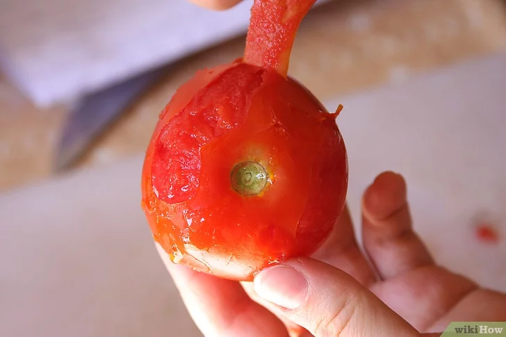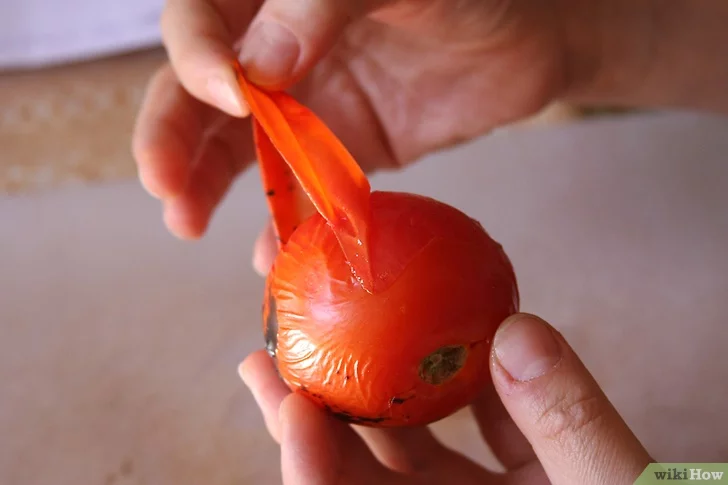 손으로 만져도 괜찮을 정도로 식으면 토마토를 얼음물에서 꺼낸다. 껍질이 쭈글쭈글하고 느슨해져 있을 것이다. 앞서 X자로 칼집을 낸 부분의 껍질을 잡고 쭉 당긴다. 이 때 껍질이 벗겨지지 않으면 작은 톱날칼로 잘라낸다.