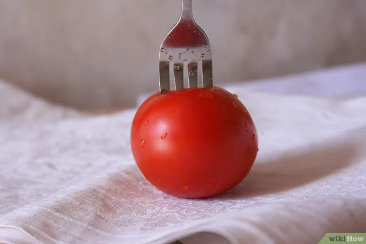 꼭지 부분에 포크를 단단히 꽂는다. 포크가 토마토에 단단히 박혀 움직이지 않아야 한다.