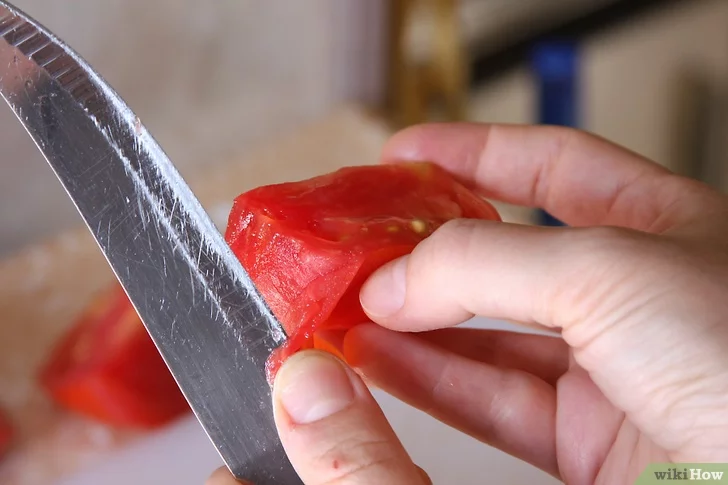 토마토 조각의 한쪽 끝부터 조심스럽게 과육에서 껍질을 잘라내기 시작한다. 가급적이면 과육은 그대로 놓아두고 껍질만 잘라내도록 한다. 토마토 조각의 한쪽 끝부터 다른 쪽 끝까지 껍질을 완전히 벗겨낸다.