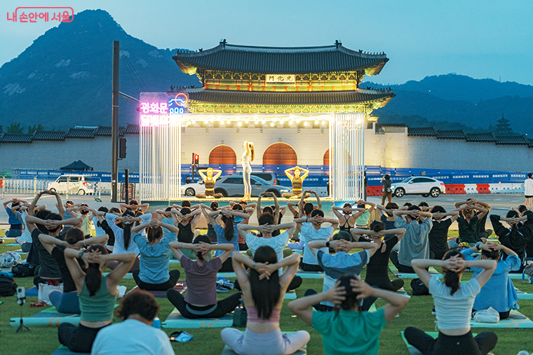 2023년 시민들이 '광화문 달빛요가' 프로그램에 참여하고 있다.