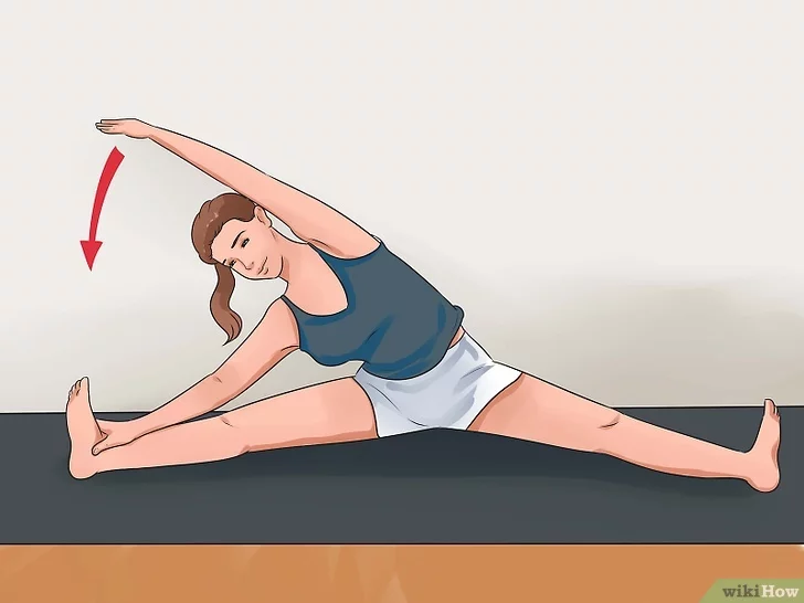 - 어깨를 돌려(엉덩이는 돌아가선 안된다) 한쪽 다리 및 엉덩이 관절 쪽으로 내려간다. 다리가 자연스레 늘어날 것이다. 엉덩이가 바닥에 닿아 있어야 한다.