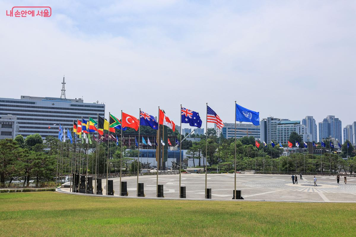 평화 광장 둘레를 따라 6·25전쟁 참전국들의 기념비와 국기가 세워져 있다. ©박우영