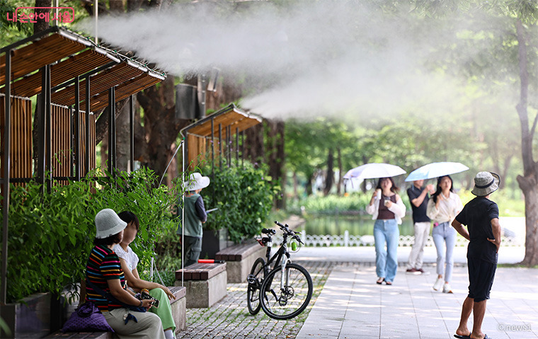 쿨링포그 아래서 더위를 피하는 시민들