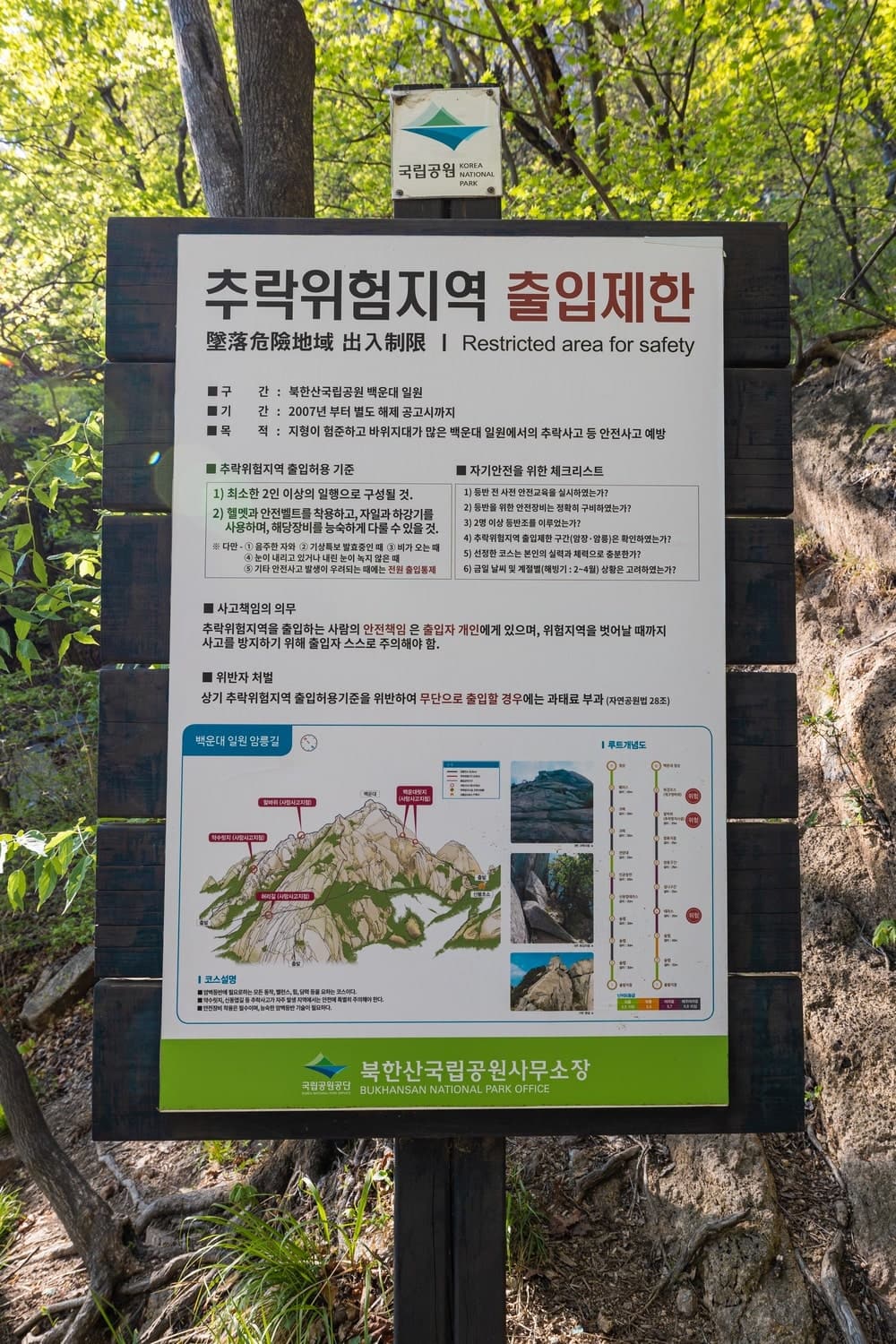 코스를 정했다면 다음으로는 등산 시 주의해야 할 점을 숙지해야 하는데 먼저, 어떤 코스를 선택하든지 반드시 지정된 등산로로만 등산해야 한다. 샛길 진입은 식물과 야생동물 서식지에 악영향을 끼칠 수 있어 금지되어 있다. 그뿐만 아니라 등산로가 아닌 경우, 대부분 길이 험하고 길을 잃기 쉬워 자칫 위험한 상황으로 이어질 수 있기 때문이다. 혹여나 발생할 위급 상황으로 도움을 요청해야 하는 경우를 대비해 코스별 안내도나 중간중간에 위치한 이정표를 통해 본인의 위치를 파악해 두는 것이 좋다.