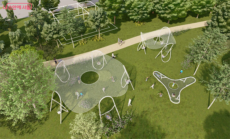 새로 개발한 펀디자인 휴게공간 ‘하늘하늘’은 자연과 어울리는 그물망을 소재로 하여 선선한 바람에 그물 지붕이 흔들려 하늘하늘한 형상을 연출하는 휴게시설물이다. 각 모듈을 활용해 가변적인 공간 구성으로 공원 어느 곳에나 적재적소에 설치되어 계절에 상관없이 그늘 및 휴게공간을 제공한다.