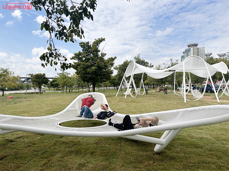 뚝섬한강공원에 펀(Fun)한 휴게공간이 등장했습니다. 공원의 지형과 그물 소재를 활용한 해먹형 휴게공간 ‘하늘하늘’입니다. 바람에 흔들리는 그물 지붕과 가변적 공간 구성이 특징인데요, 약 한 달간만 설치된다고 하니 올가을 서울국제정원박람회도 구경하고 ‘하늘하늘’에 누워 청명한 하늘을 만끽해 보세요!