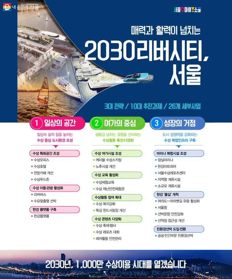 ‘한강 수상활성화 종합계획’은 한강을 매력과 활력이 넘치는 ‘2030 리버시티, 서울’로 조성하기 위한 3대 전략, 10개 추진과제, 26개 세부사업으로 구성됐다. 3대 전략은 ①일상의 공간 ②여가의 중심 ③성장의 거점이다. 총 예산은 5,501억 원이 투입된다.(민간 3,135억 원, 재정 2,366억 원)