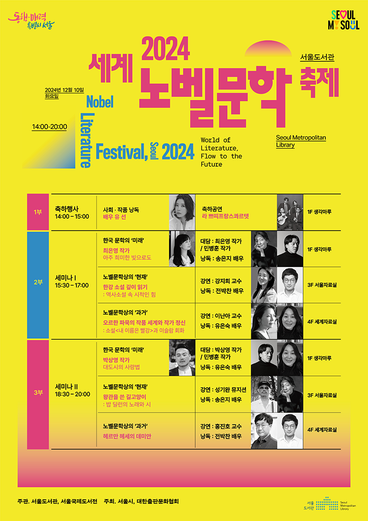 서울시는 한강 작가의 노벨문학상 시상일인 12월 10일 서울도서관에서 ‘2024 세계노벨문학축제’를 개최한다. 이번 행사는 대한민국 최초의 노벨문학상 수상을 축하하고 기념하는 자리로 책을 사랑하는 모든 시민이 ‘축제’처럼 즐길 수 있도록 기획했다. 오후 2시부터 8시까지, 총 3부에 걸쳐 진행된다.