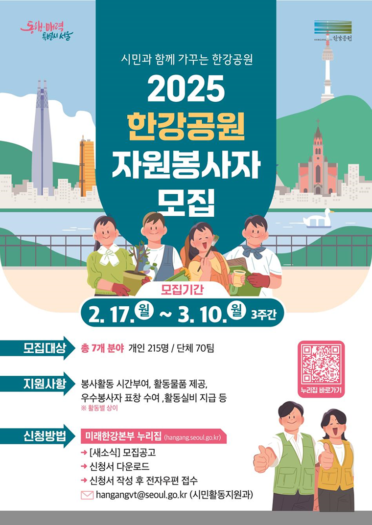 서울시는 2월 17일부터 3월 10일까지 3주 동안 올해 11개 전체 한강공원 곳곳에서 활동할 개인 자원봉사자 215명과 단체 70팀을 모집한다. 최종 선발된 자원봉사자는 오는 3월부터 11월까지 활동에 참여하게 된다.