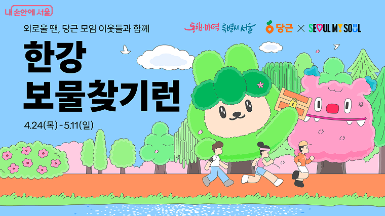 서울시는 당근과 함께 한강공원 3곳(▴반포 ▴망원 ▴뚝섬)에서 4월 24일부터 5월 11일까지 ‘한강 보물찾기런’ 행사를 진행한다. 이번 행사는 시민들이 이웃과 함께 걷고 달리며 보물을 찾는 과정에서 소소한 성취감과 즐거움을 느끼고, 자연스럽게 서로 교류해 외로움을 해소할 수 있도록 기획됐다.