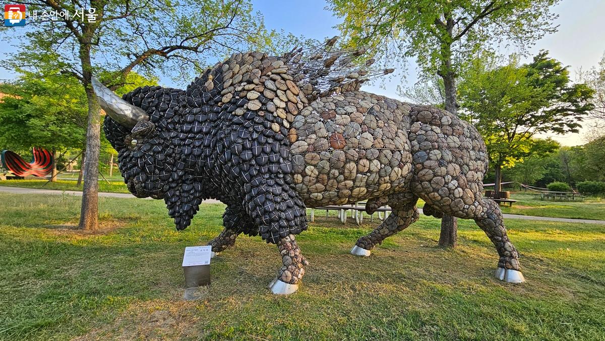 한강공원에서 진행 중인 '견생조각전'. 작가 조덕래의 작품 <대지의 기업_버팔로>