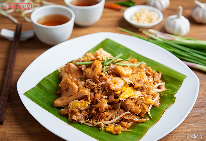 넓적한 쌀국수를 진한 간장 소스와 해산물, 숙주 등과 함께 볶아낸 요리. 달짝지근하면서도 불 맛이 살아 있어 현지 포장마차에서 특히 인기가 많다.