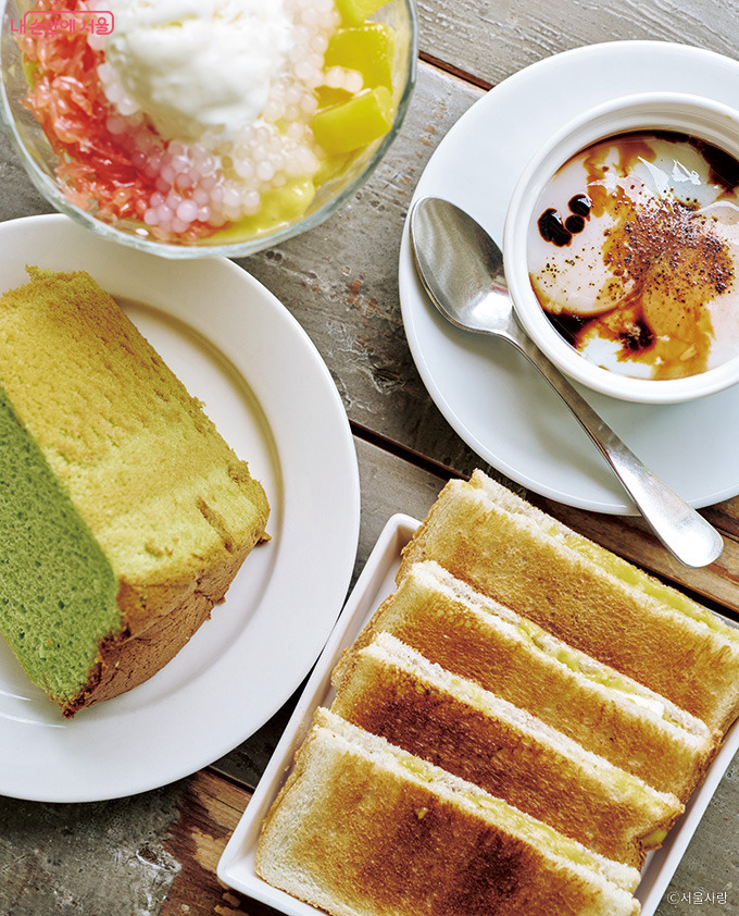 여름철 인기 메뉴인 망고 포멜로 빙수는 망고 셔벗, 망고 큐브, 바닐라 아이스크림, 자몽 알갱이, 사고(Sago) 펄을 층층이 쌓은 디저트로 진한 망고의 풍미와 탱글한 식감이 매력적이다. 무방부제 천연 카야잼을 넣은 카야 토스트는 현지 방식 그대로 간장 반숙 달걀에 찍어 먹을 수 있도록 제공된다. 싱가포르 수상 부부와 대사 부부가 직접 방문한 곳으로, 외교 행사 디저트로도 소개된 바 있다.