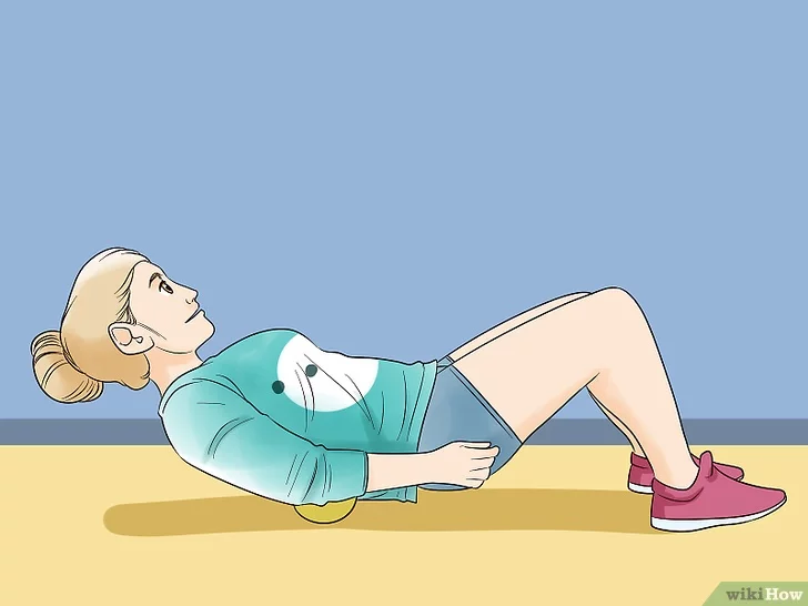 허리 밑에 테니스 공을 둔 뒤 그 위에 부드럽게 누우세요. 무릎을 굽히고 발은 땅에 두세요. 조임이 느껴지는 근육 부분을 공에 대고 천천히 부드럽게 굴려 그 곳의 뭉친 근육을 완화시키세요.