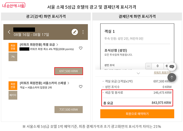 그러나 이번 실태조사를 통해 확인된 서울시 소재 5성급 호텔의 27개 홈페이지 대부분은 세금 및 기타 비용을 제외한 가격으로 표시하고 있으며, 실제 결제액과는 10~21% 차이가 발생해 첫 화면만 보고 바로 결제하면 예상보다 큰 금액을 지불할 수 있다.