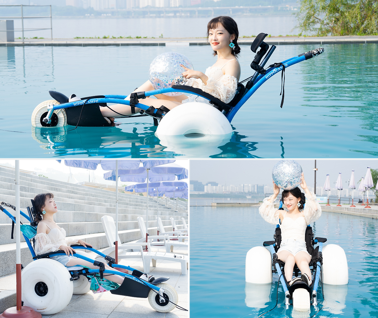 이처럼 한강의 여름을 만끽하기에 이상적인 한강 수영장은 휠체어 사용자를 포함하여 누구나 편히 이용할 수 있는 시설을 갖추고 있습니다. 특히 뚝섬 한강공원수영장과 과 여의도 한강공원수영장, , 난지 한강공원물놀이장, , 양화 물놀이장 에는 수영장 입수를 위한 경사로가 설치되어 있어 휠체어 사용자도 용이하게 사용할 수 있답니다. 여기에 더해 서울다누림관광 홈페이지에서 해변용 휠체어를 무료로 대여하면 금상첨화! 해변용 휠체어는 물에서도 뜨기 때문에 물놀이에 안성맞춤일 뿐만 아니라, 모래사장에서도 이용 가능하다고 하니 올여름 시원한 휴가를 계획 중인 휠체어 사용자라면 예약은 선택이 아닌 필수겠죠?