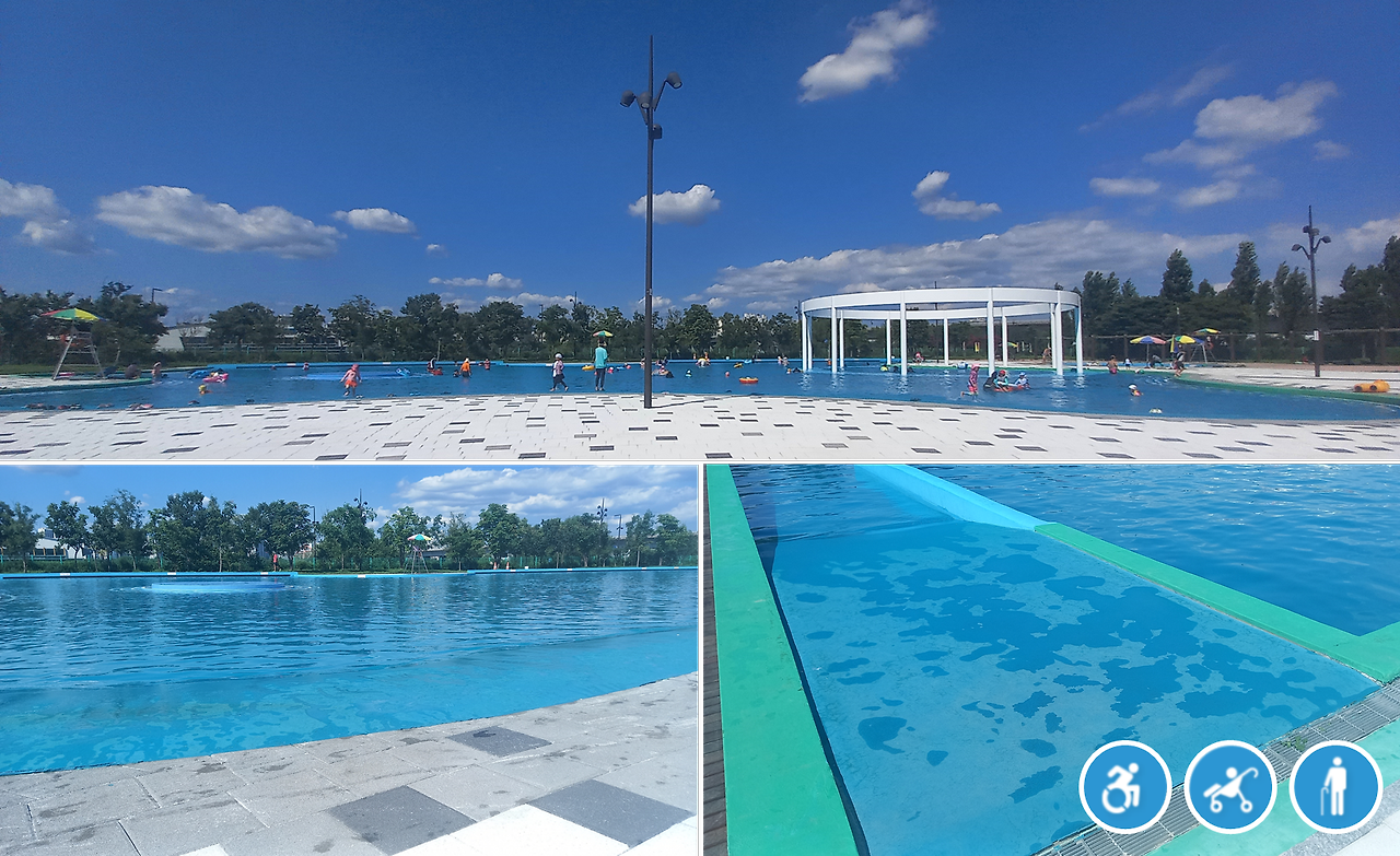 · 휠체어 동선| 도보로 방문하는 경우, 출입구와 가장 가까운 보행로(인피니트숲과 소녀시대숲 사이)는 계단이 있어 주차장 진입로를 이용해야 하는데 경사가 가파른 편이에요. 수영장 내부는 시설 전체가 평지로 조성되어 있어요. 단, 남녀 탈의실 입구에 얕은 턱이 있어요.
