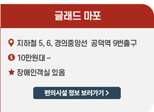 마포에 여정을 풀기로 했다면 주목할 만한 또 다른 숙박 시설로 공덕역에 인접한 또 다른 접근성 좋은 호텔, 글래드 마포를 추천합니다. 건물의 상층부에 위치해 객실에서 호텔과 인접한 경의선 숲길을 위시해 서울 야경을 조망하기에 좋습니다. 가격대도 합리적이어서 서울 호캉스 목적지로 손꼽히는 호텔입니다.