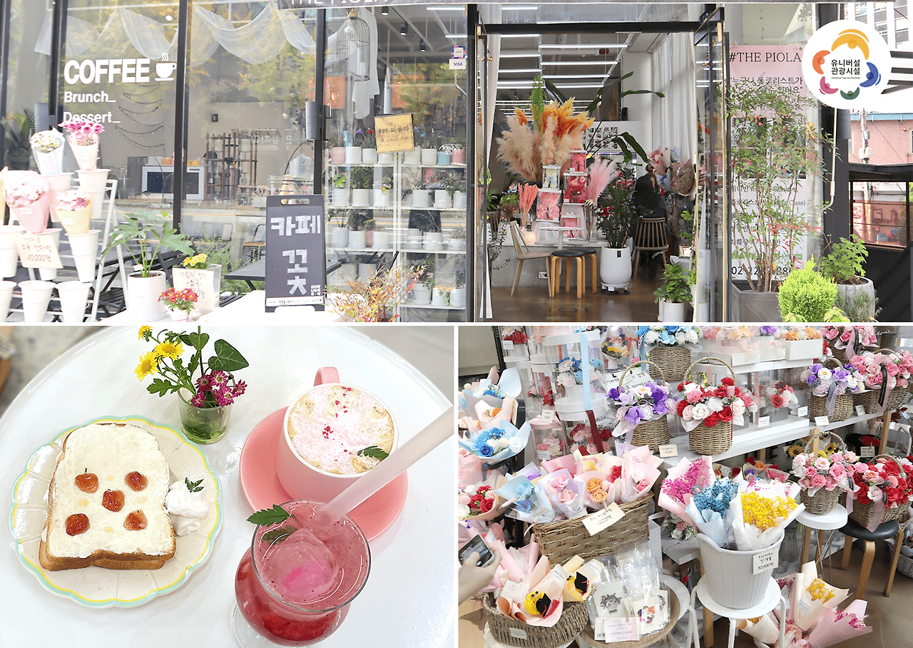 동대문디자인플라자와 동대문역사문화공원역에 인접해 접근성이 좋은 카페 , 더피올라플라워 는 가게 외관에서 볼 때는 화사한 꽃다발과 화분이 줄지어 전시되어 있어 단지 꽃집으로 착각할 수 있지만 , 엄연히 티타임을 즐길 수 있는 공간입니다 . 화사하게 핀 꽃과 향기로운 꽃내음에 둘러싸여 다양한 이색 메뉴를 즐길 수 있는데요 , 특히 시즌별로 다양하게 선보이는 딸기와 자몽 , 레몬 , 유자 , 망고 등 달콤한 과일을 활용한 음료와 요거트 , 베이커리 메뉴가 고루 인기를 끌고 있다고 합니다 .