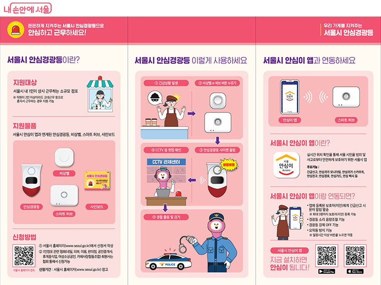 최근 큰 관심을 모은 서울시 휴대용 안심벨 ‘헬프미’와 함께 대표적인 일상안심 정책으로 꼽히는 ‘1인점포 안심경광등’도 직원 없이 혼자 일하는 이른바 ‘나홀로 사장님’들의 호평을 받고 있다.
