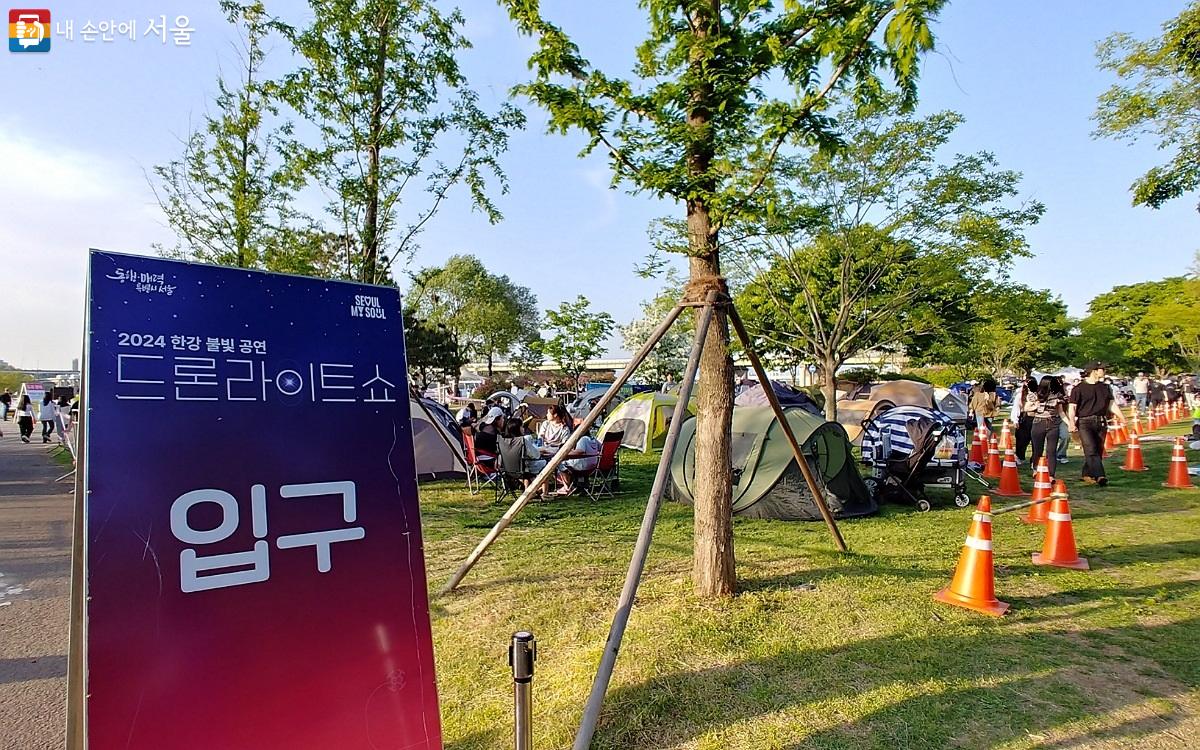 드론 라이트 쇼를 관람하기 위해 일찌감치 자리를 잡고 있다. 많은 시민들이 미리미리 자리에 돗자리를 깔고 그늘 아래에서 휴식을 취하고 있다. 그늘막을 친 시민들도 보인다. 그늘막은 설치할 수 있는 구간이 따로 있고, 해가 질 때쯤이면 모두 그늘막을 걷어야 한다.