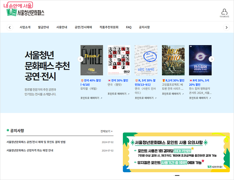 서울청년문화패스 누리집에서 원하는 공연 및 전시를 예매할 수 있다.