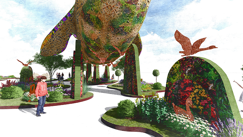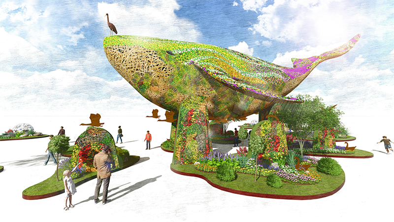- 2024고양국제꽃박람회 주제를 알리는 꽃등고래와 재두루미 상징 조형물 연출
