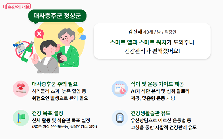 대사증후군은 기존 보건소 방문을 통해 관리되었으나 손목닥터 앱을 통해 대사증후군 검사 결과를 스스로 모니터링하고 걸음, 식단 정보 등 건강데이터를 AI가 분석‧평가하여 개인별 맞춤형 건강관리 프로그램을 제공한다.