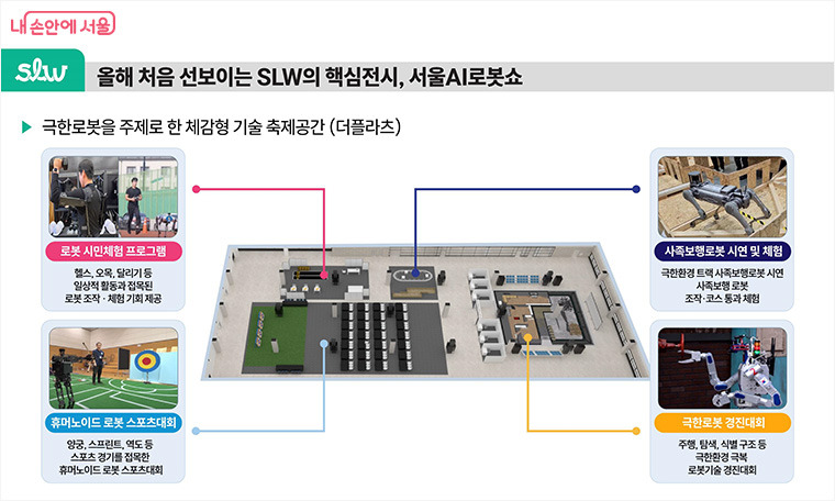 올해 SLW의 핵심 콘텐츠는 단연 ‘로봇’. 전시관 메인행사 중 하나로 ‘극한로봇’을 주제로 한 ‘제1회 서울AI로봇쇼’가 열린다. 실제 현장에서 인간과 협업하고 극한환경을 돌파해 나가는 로봇들이 시민 앞에 ‘살아있는 기술’로 등장해 새로운 시각을 제공한다.