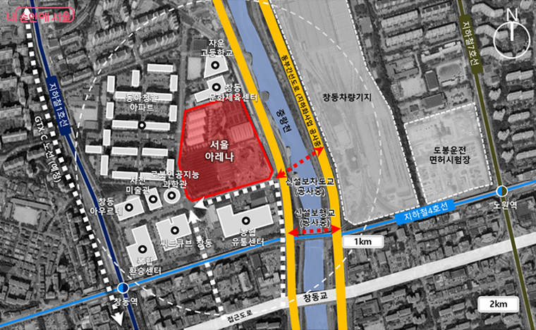 서울아레나는 지하철 1·4호선이 지나는 창동역, 4·7호선이 지나는 노원역과 인접한 곳에 조성된다. 창동역에 들어서는 GTX-C 노선 도입과 현재 공사 중인 동부간선도로도 지하화까지 마무리되면 서울아레나 교통 편의는 더욱 확대될 것으로 전망된다.