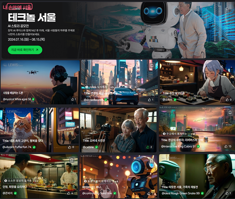 이밖에 ‘슈퍼히어로’, ‘타임루프’, ‘두뇌 싸움이 펼쳐지는’ 등 독특한 프롬프트를 사용해 생성된 ▴한강의 초능력 상어 ▴로봇요리대회 ▴어르신들의 인기만점 기억여행사 ▴舊서울의 방구석 백수가 뉴서울의 택배 기사가 되다 등 기발한 주제의 스토리들도 눈길을 끌었다.